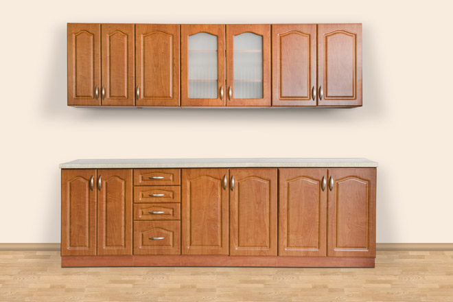 Zestaw w cenie promocyjnej w wymienionym wymiarze, kolorze blatu, uchwytach - kolorystyka frontów, korpusów oraz wzorów frezowań z asortymentu frontów promocyjnych.